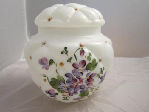 Title (ebay affiliate link): Vintage Consolidated Milk Glass Bisquit Tuffed Pillow Hand Painted Cookie Jar