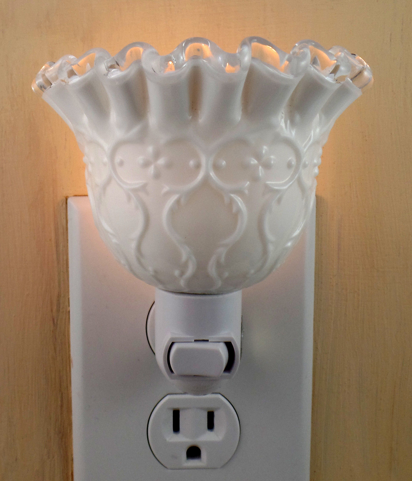 Title (ebay affiliate link): Fenton Milk Glass SPANISH LACE Pattern Silver Crest Custom Bell Night Light