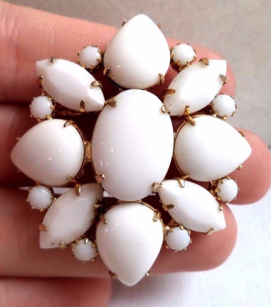 Title (ebay affiliate link): VINTAGE ESTATE HIGH END MILK GLASS RHINESTONE FLOWER 1 7/8" BROOCH!!! G6381U