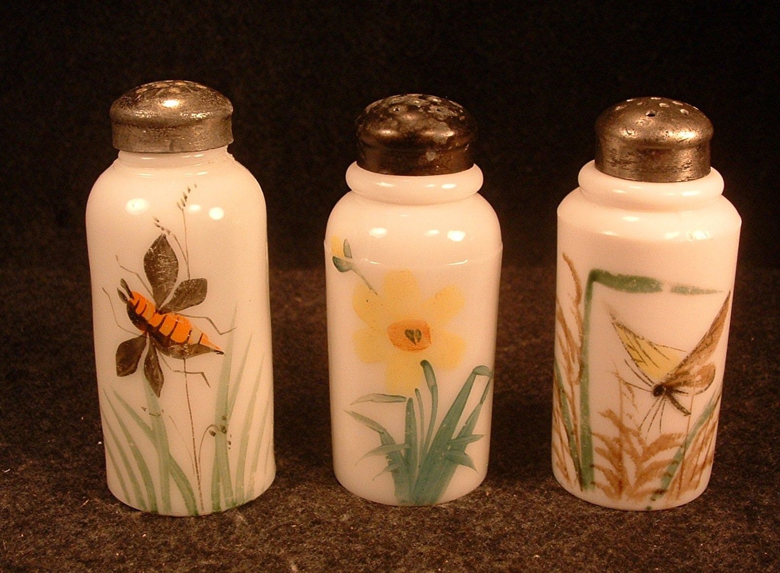 Title (ebay affiliate link): 3 Victorian Floral Dec. White Milk Glass Salt Shakers Mt. Washington ? Lot #3