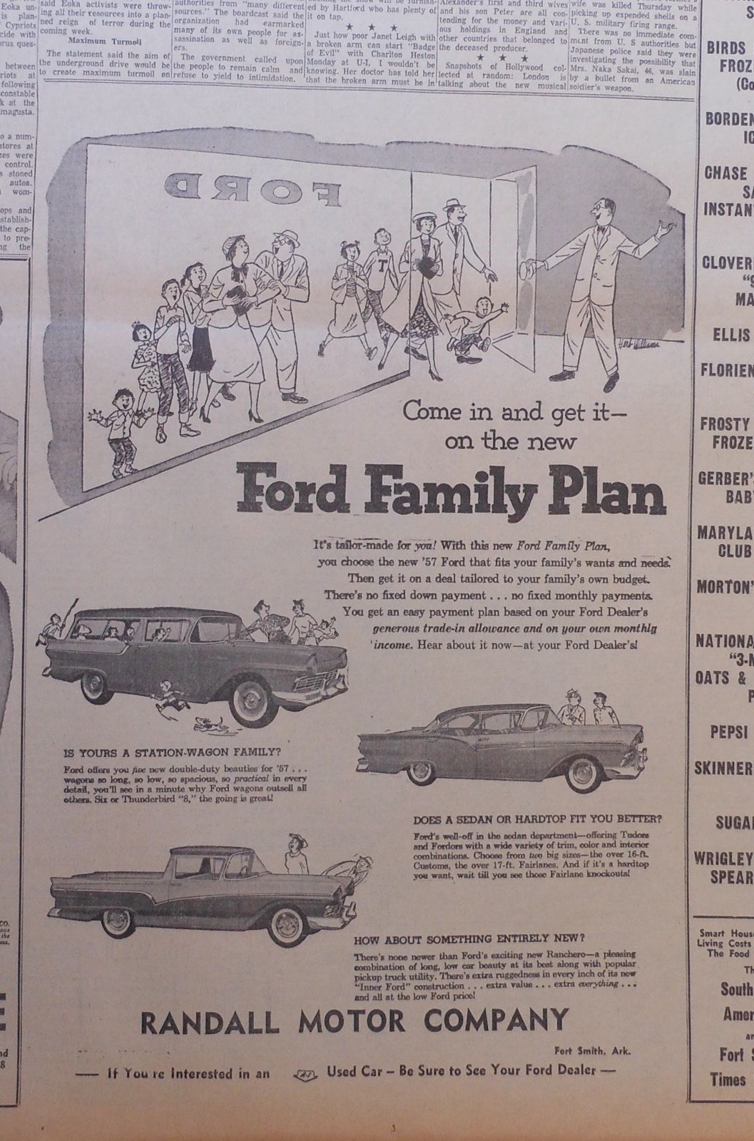 Title (ebay affiliate link): 1957 newspaper ad for Ford - Family Plan, Station Wagon, Sedan or Ranchero?