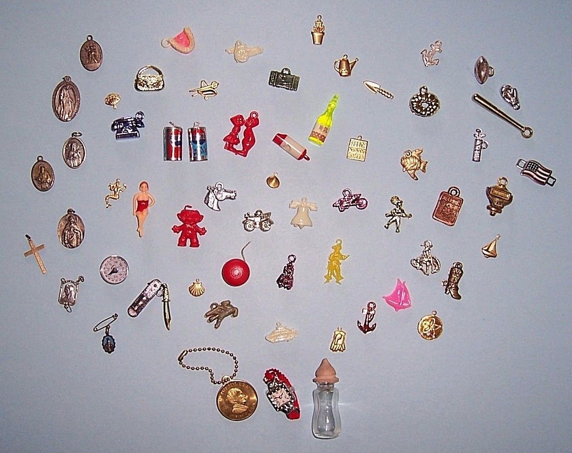 Title (ebay affiliate link): VINTAGE LOT OF 50 METALLIC CELLULOID METAL CRACKER JACK CHARMS ~ GUMBALL PRIZES
