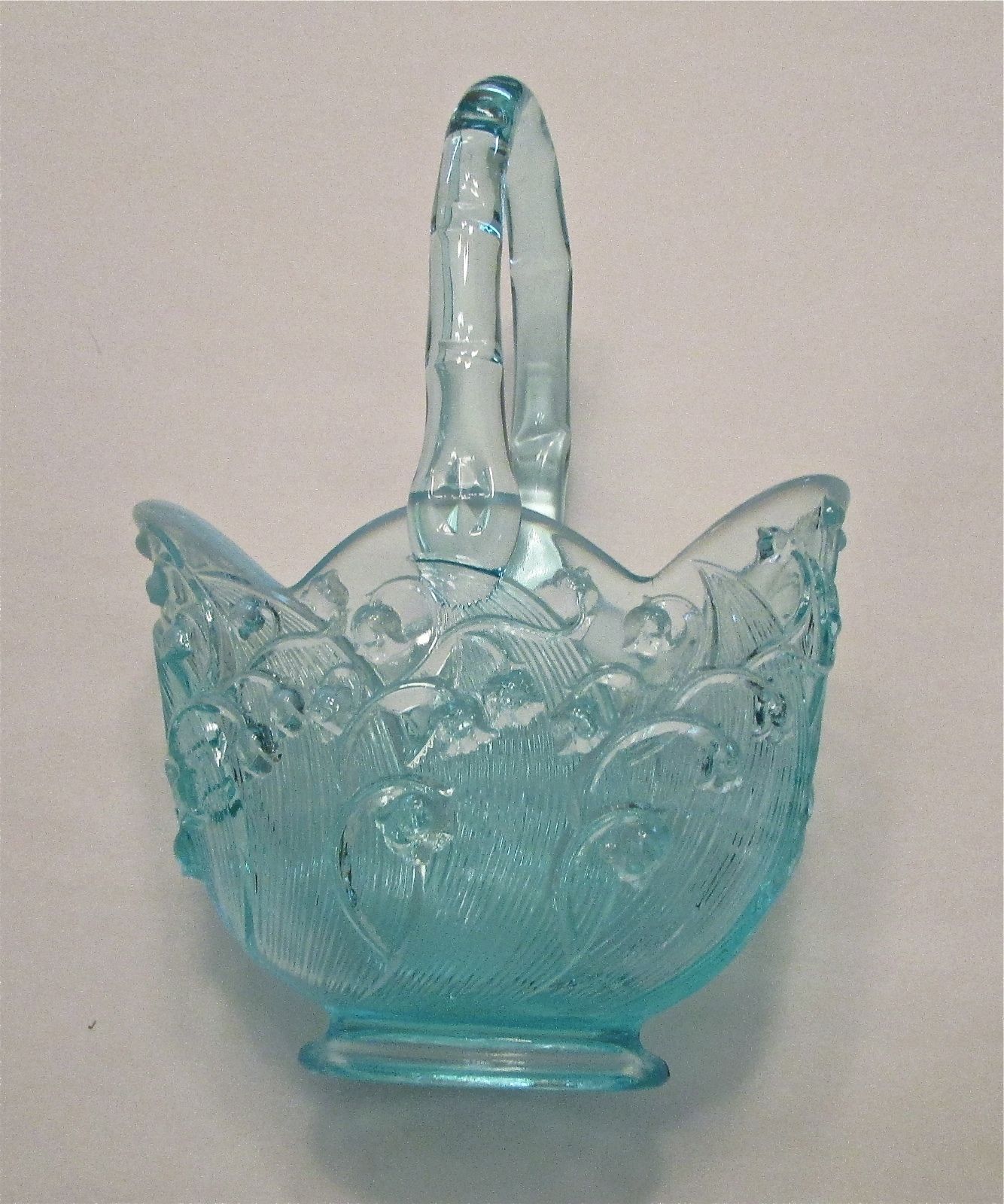 Title (ebay affiliate link): Vintage Fenton Basket LILY OF THE VALLEY Turquoise Blue 8x6" milk glass edge