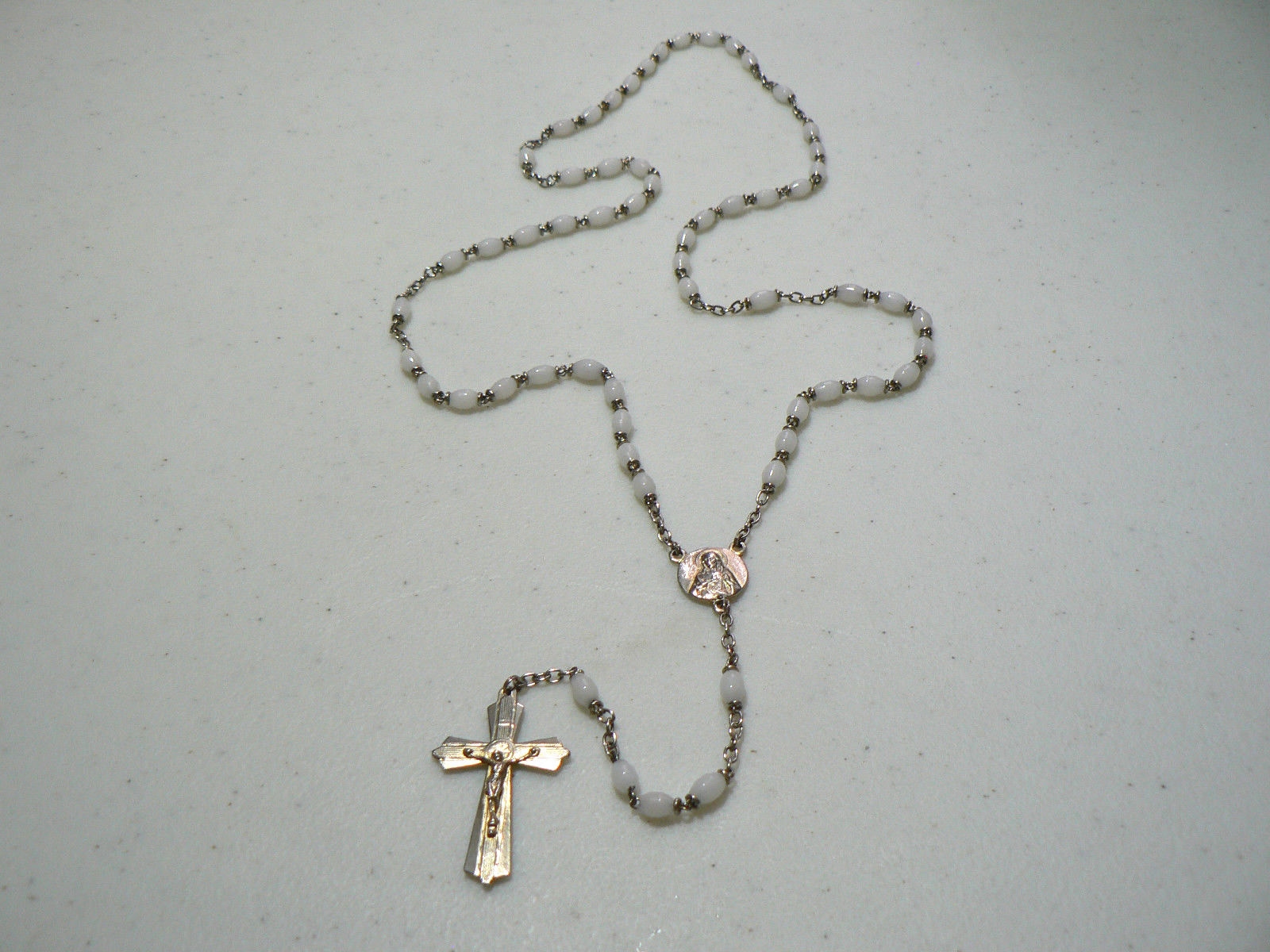A VINTAGE / PRE-OWNED MILK GLASS BEAD 5 DECADE ROMAN CATHOLIC HOLY ROSARY