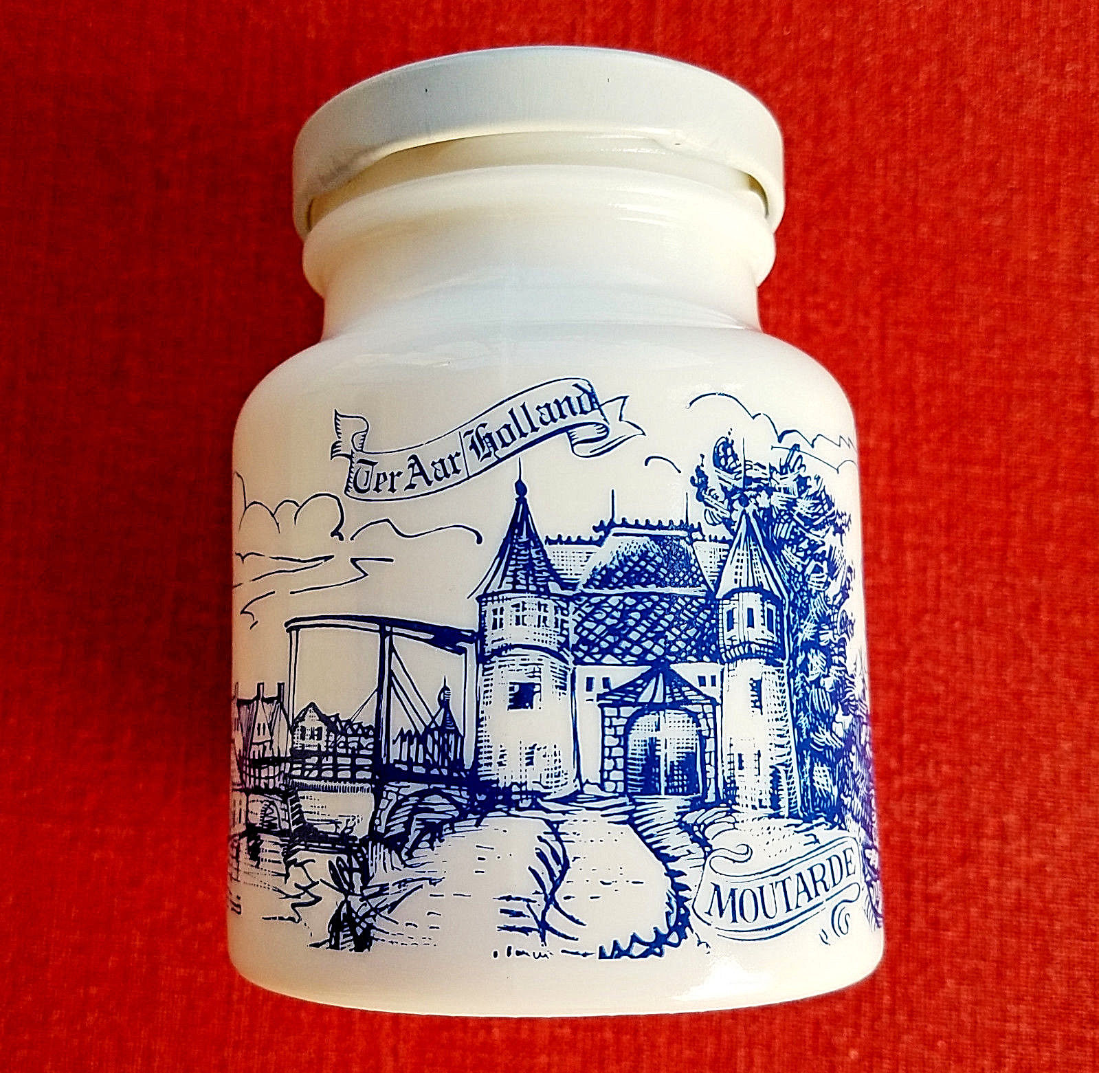 French Mustard Jar-White Milk Glass w/ Blue Village Details