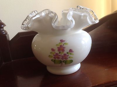 Fenton White Milk Glass Silver Crest Hand Painted Purple Violets Signed Vase