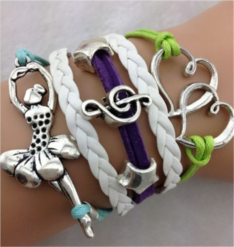 Title (ebay affiliate link): Infinity double heart break Music Girl Antique Silver Leather Charm Bracele