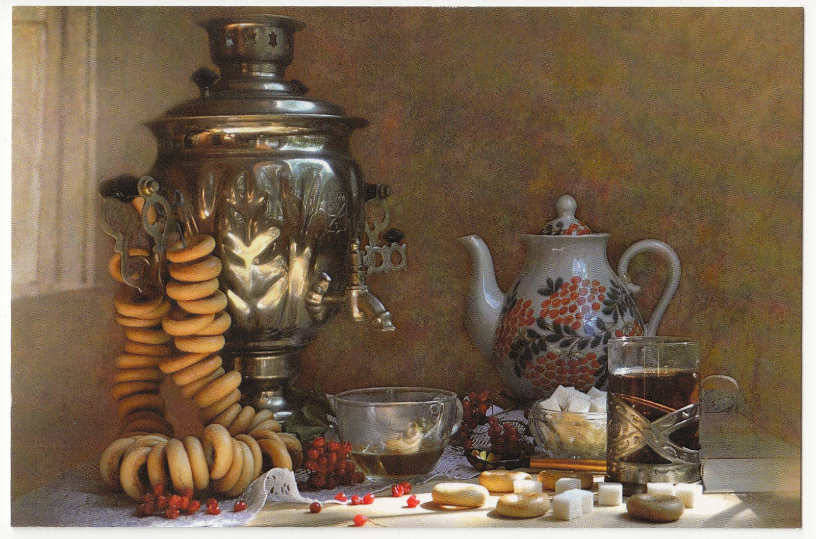 Samovar,Tea table Bagels, sugar modern Russian card