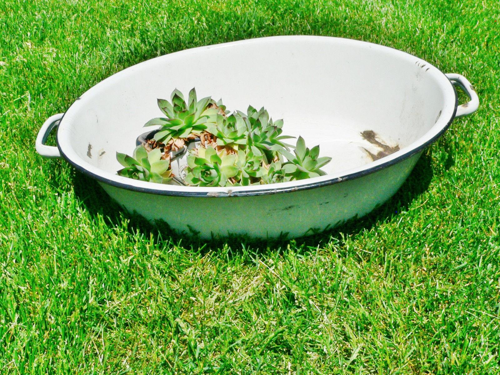 Title (ebay affiliate link): Vintage Enamelware Steel White Oval Wash Basin Wash Tub Primitive Planter Handle