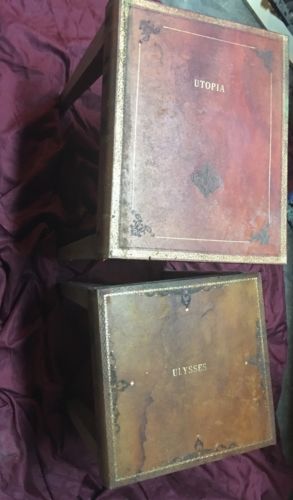 Title (ebay affiliate link): TWO VINTAGE END SIDE TABLE Book Wood Utopia Ulysses Greek Book Tables