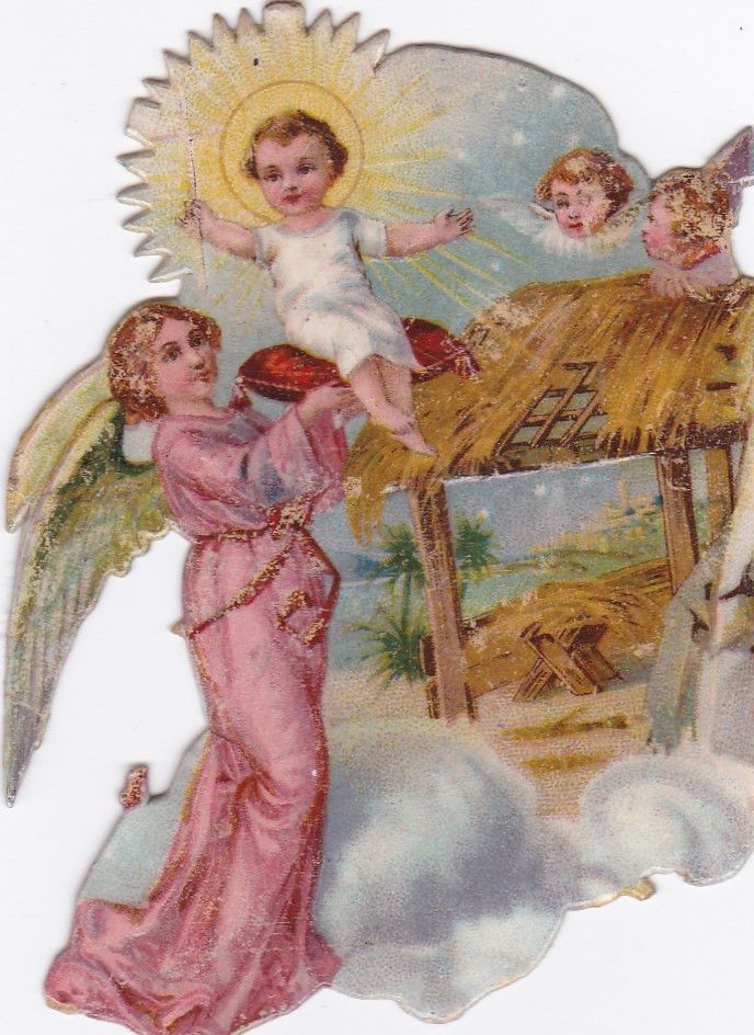 Antique Victorian Die Cut Scrap Christmas Baby Jesus & Angels Very Rare! 1800''s