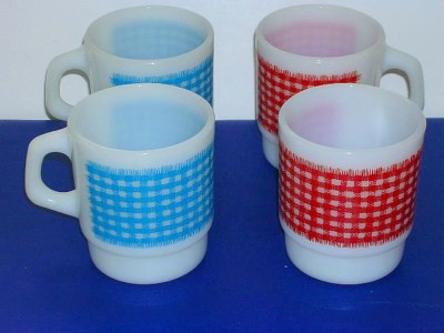 4 Vintage Fire King Gingham Pattern Milk Glass Mugs VGC
