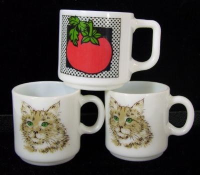 Vintage Tomato Cats White Milk Glass Coffee Mugs Cups
