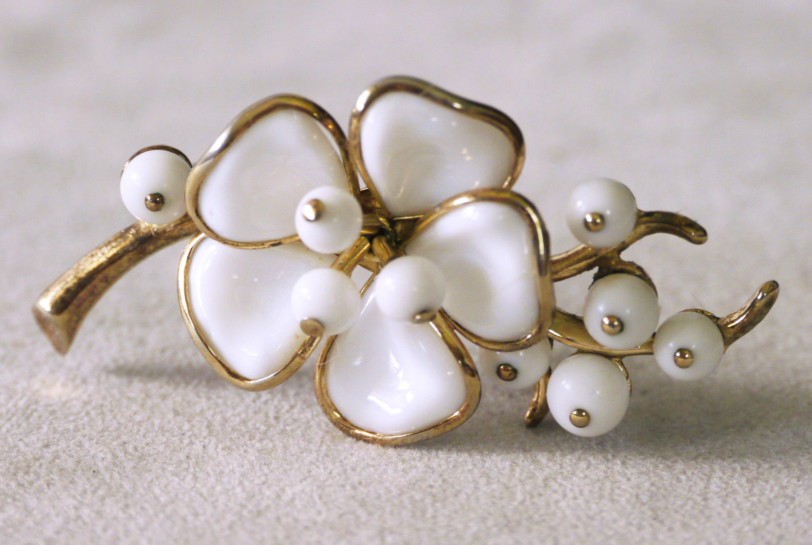 Vintage Crown Trifari Pat. Pend. Alfred Philippe milk glass floral brooch