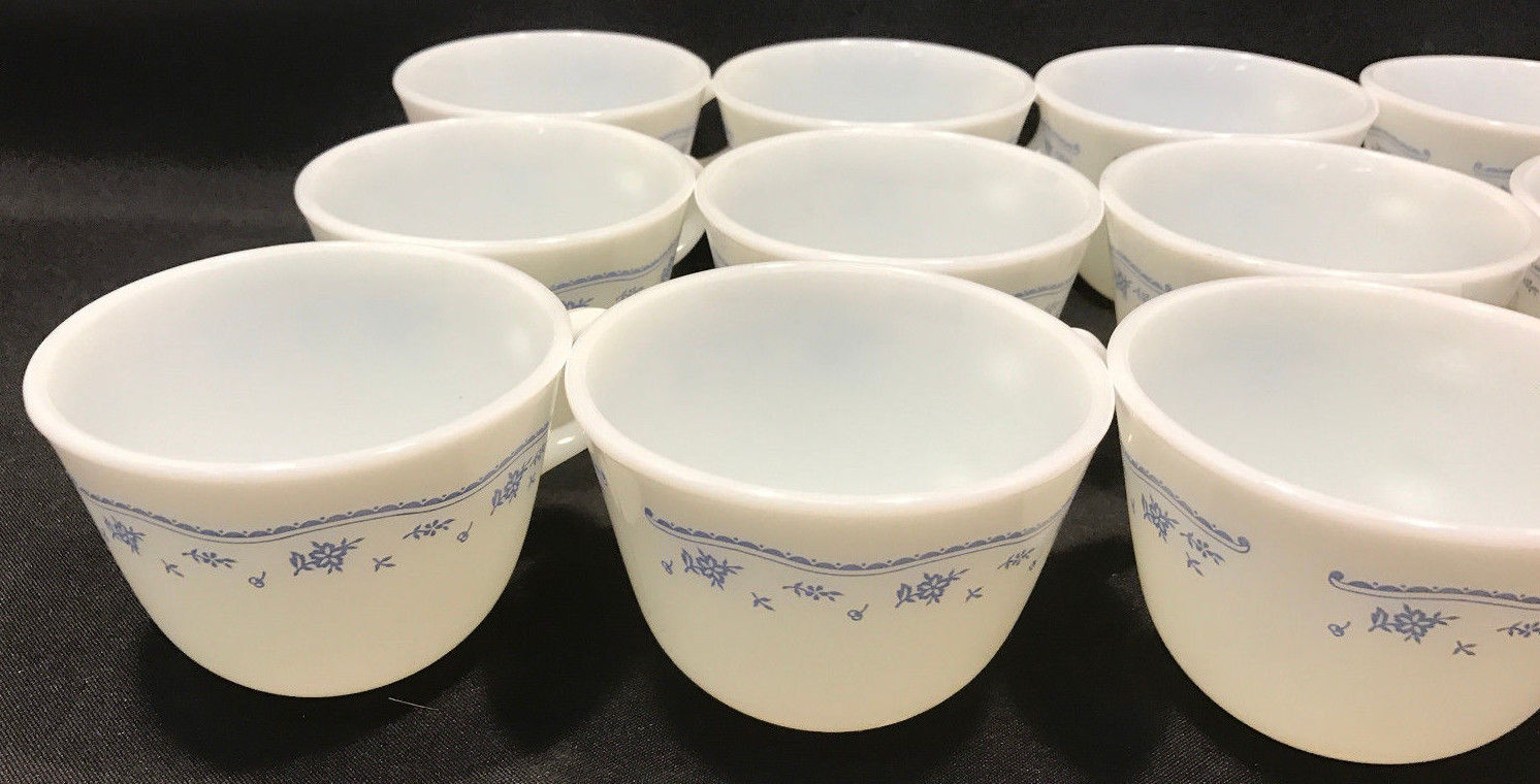 Title (ebay affiliate link): Set of 12 Vintage Pyrex MORNING BLUE Coffee Mugs Tea Cups Excellent Milk Glass