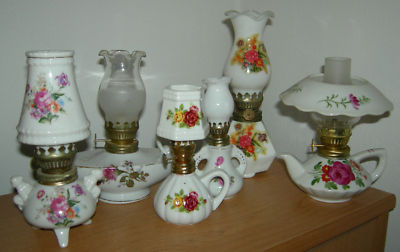 Lot of 6 Milk White w/ Flowers Miniature Oil Lamps