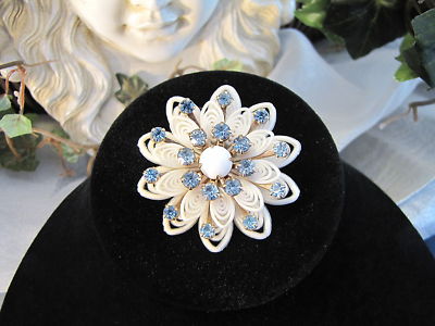 Vintage Brooch Pin Milk Glass Cabachon Blue Rhinestones