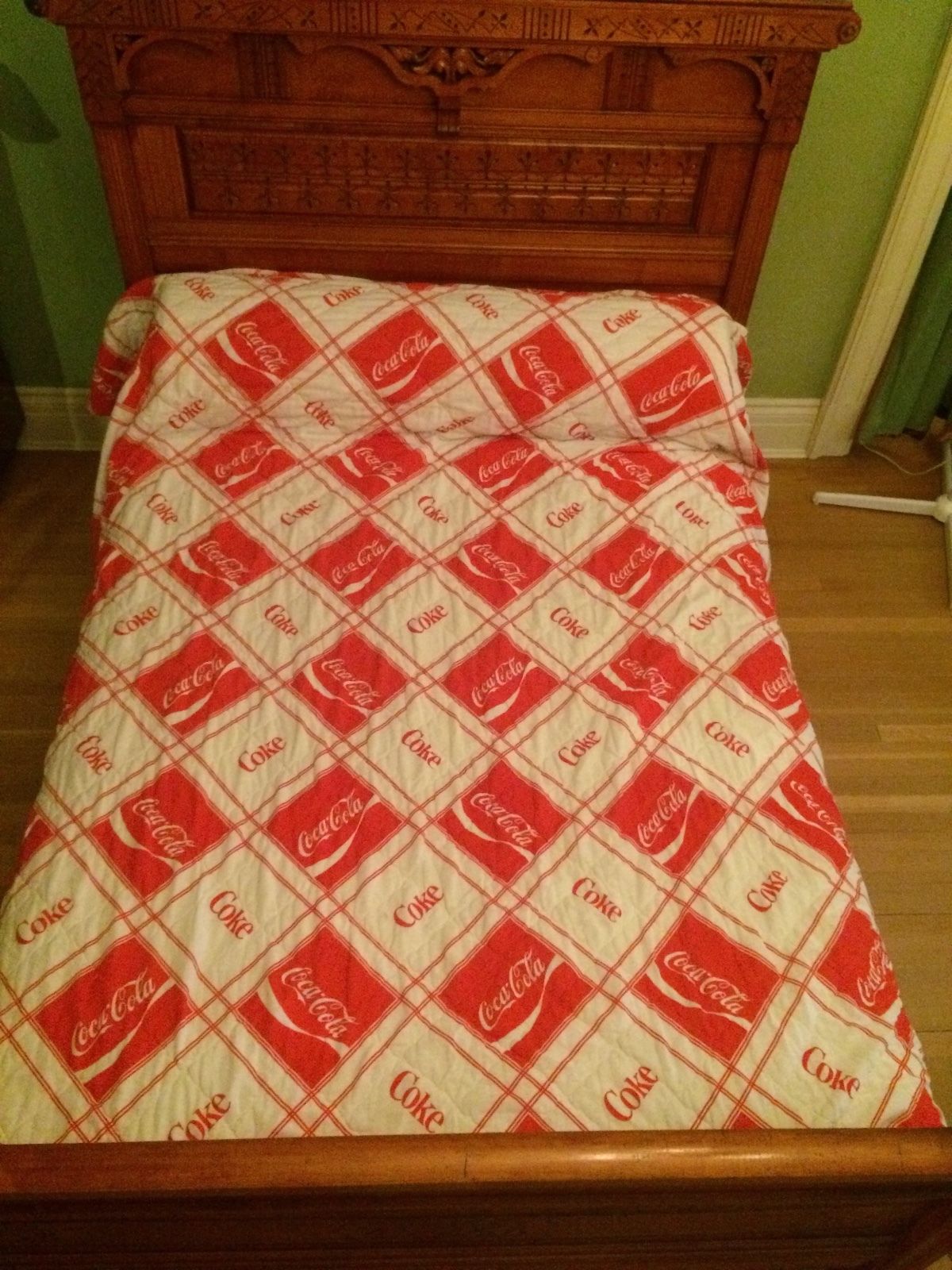 Title (ebay affiliate link): Vintage Coke Coca Cola Full Bed Spread Comforter Quilted 1970s Promotion