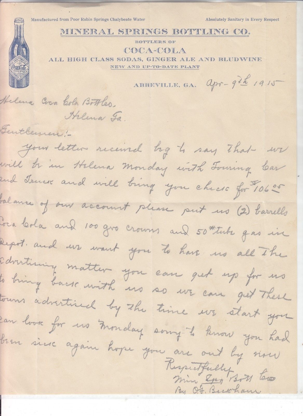 MINERAL SPRINGS BOTTLING CO. BOTTLERS OF COCA-COLA LETTERHEAD DATED APR, 9-1915