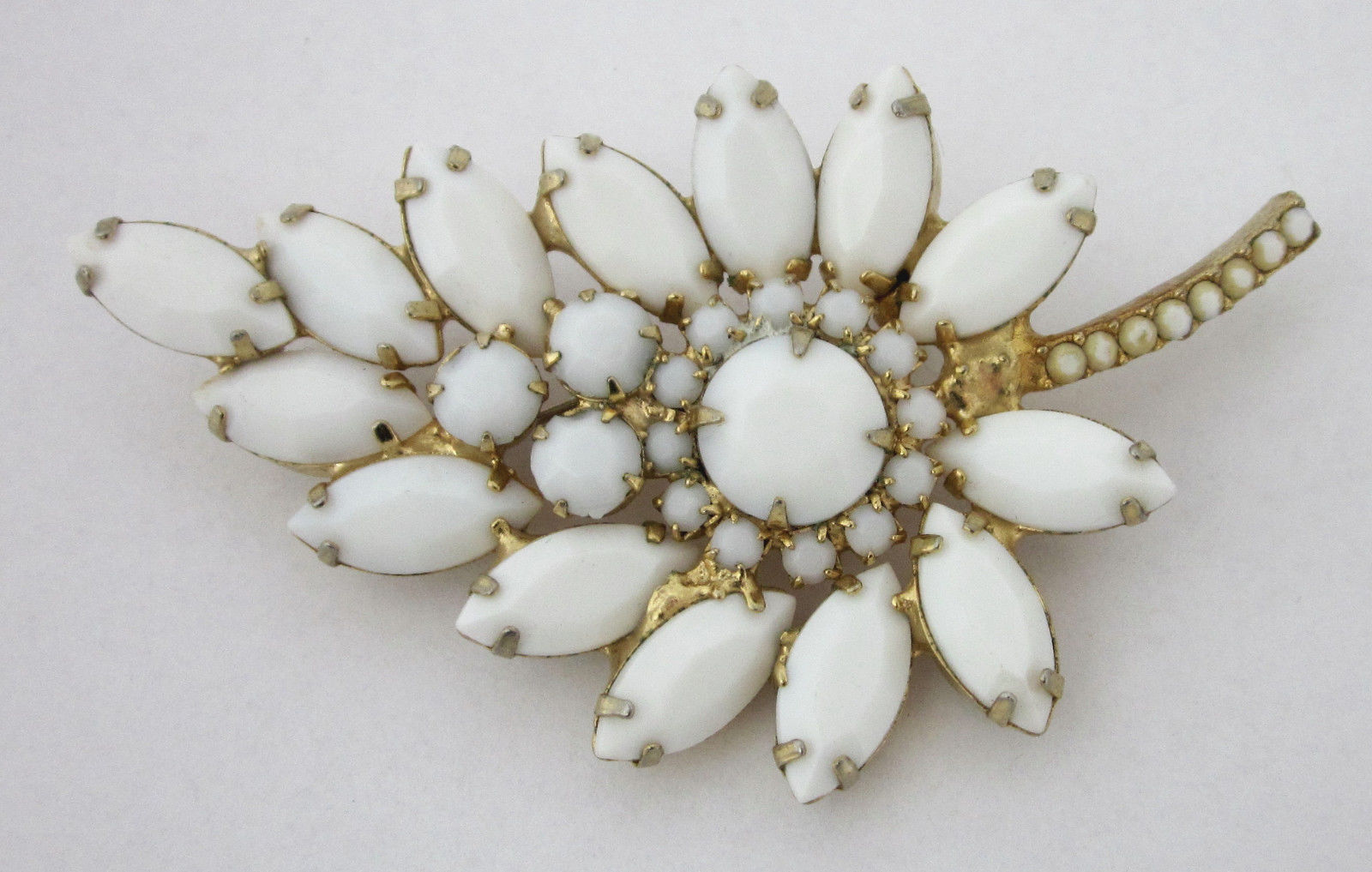 Vintage Milk Glass Rhinestone Leaf Brooch