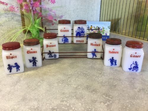 Title (ebay affiliate link): Set of 8 Vintage DOVE Frank Tea & Spice Co. Milk Glass Shaker + Rack