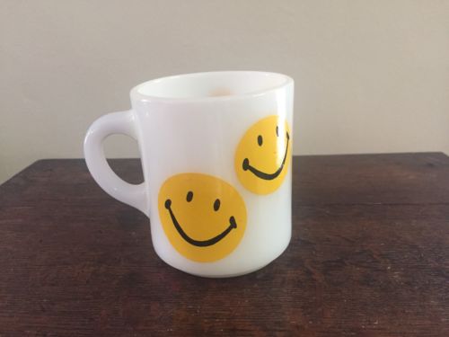 Title (ebay affiliate link): Vintage Milk Glass with Yellow Smiley Faces Coffee Cup Mug
