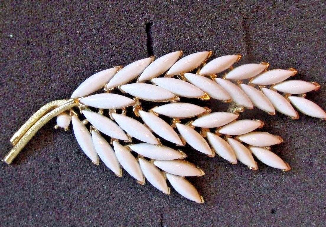 Title (ebay affiliate link): vintage Signed CROWN TRIFARI Domed White Milk Glass Navette 4" Leaves Brooch