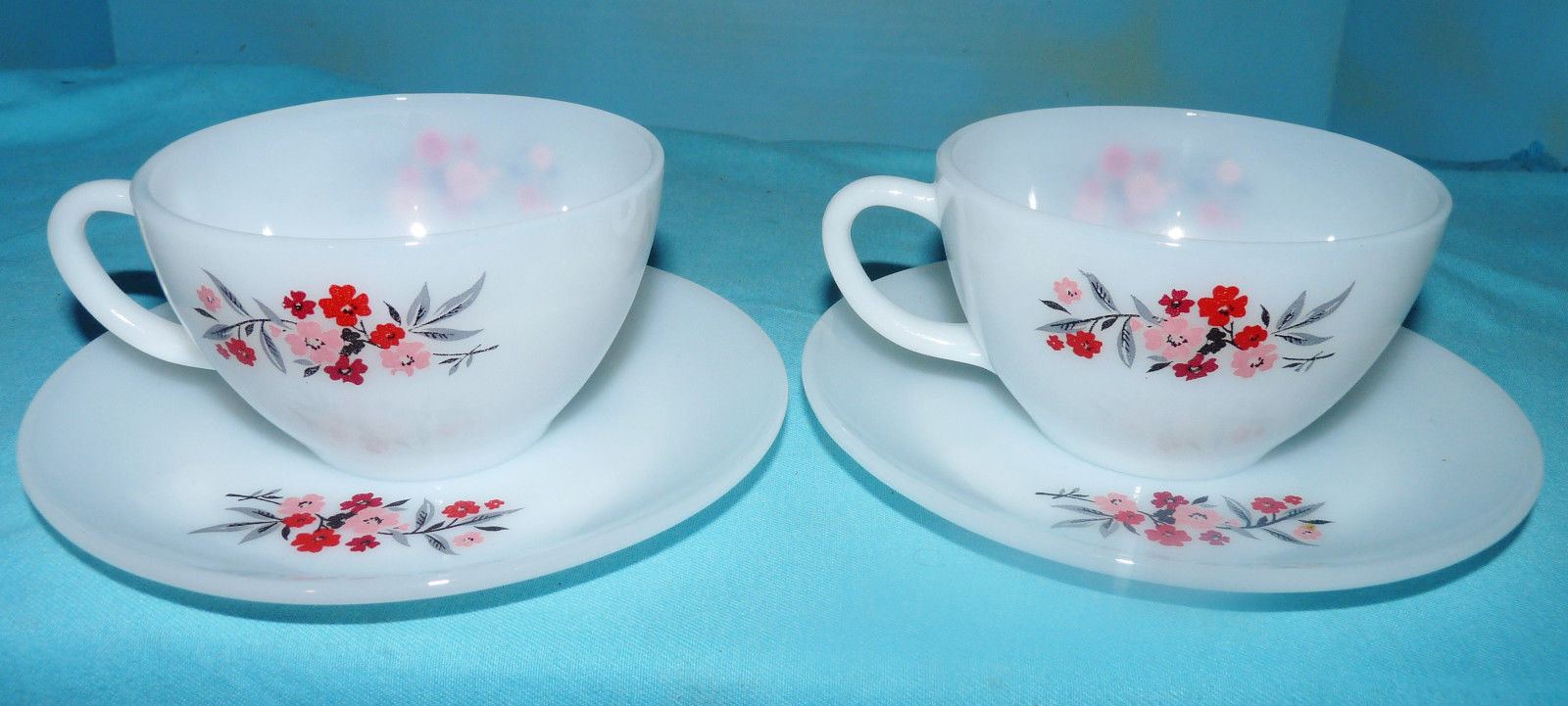 Title (ebay affiliate link): Vtg~Fire King~RED PRIMROSE~2 CUPS & 2 SAUCERS~Red/Pink Flowers~Milk GLASS~1950s