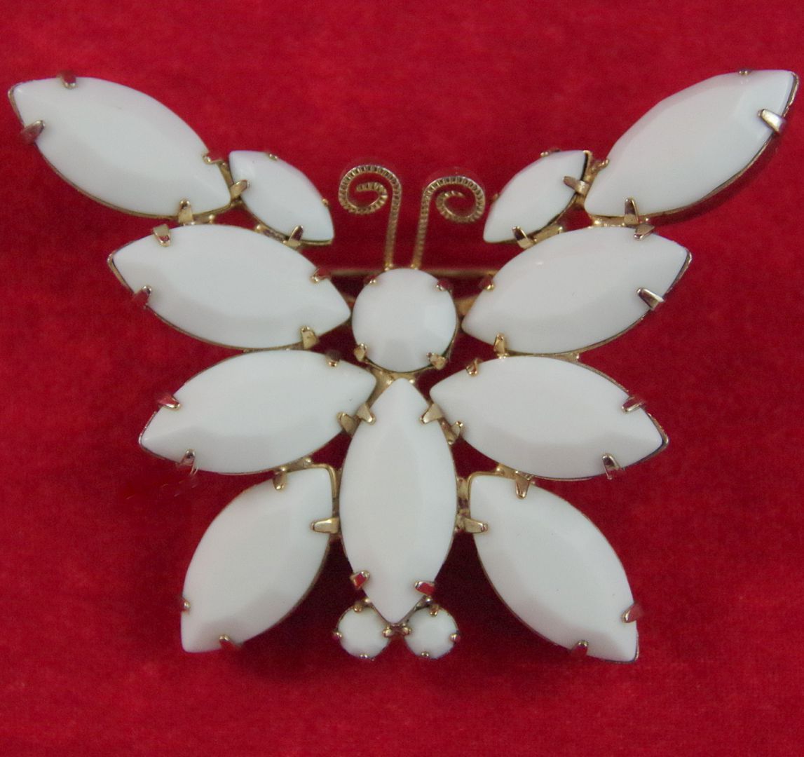 Title (ebay affiliate link): VTG VERIFIED D&E JULIANA White Milk Glass Prong-Set Rhinestone BUTTERFLY Brooch