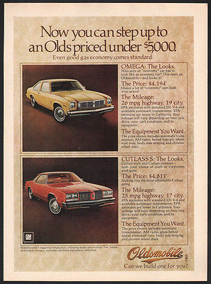 1977 Oldsmobile ad yellow Omega Coupe red Cutlass S Coupe