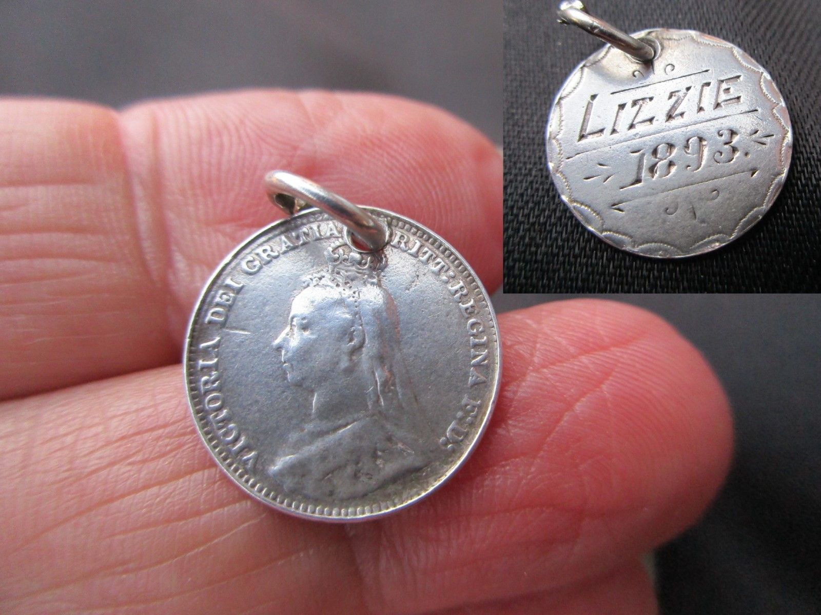 Title (ebay affiliate link): ANTIQUE VINTAGE VICTORIAN SILVER LIZZIE COIN LOVE TOKEN FOB CHARM PENDANT 1893