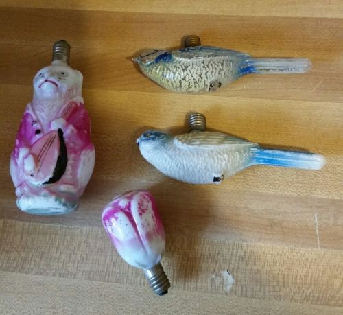 Title (ebay affiliate link): Vintage Lot of 4 Figural Milk Glass Christmas Tree Light Bulbs Cat W/Mandolin