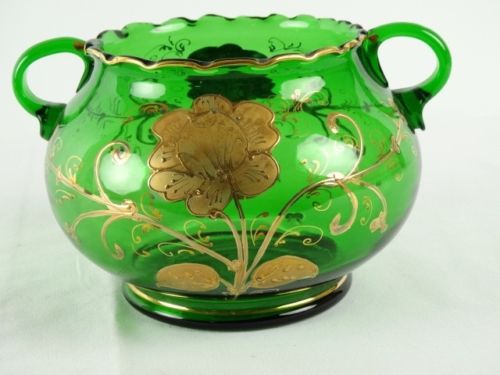 Title (ebay affiliate link): Antique 19thC Hand Blown Emerald Green Glass Bowl 22k Gold applied Bohemia 1880