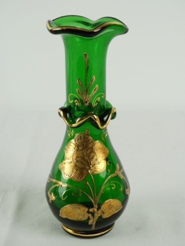 Title (ebay affiliate link): Antique 19thC Hand Blown Emerald Green Glass vase 22k Gold applied Bohemia 1880