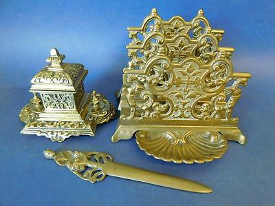Lovely 1800s Antique Ornate Brass Letter Stand, Knife & Inkwell Ink Stand