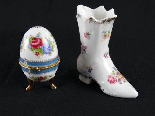 Title (ebay affiliate link): 2 Rose Porcelain Items - Dresden ceramic Boot Vase & a Gilt brass bound egg
