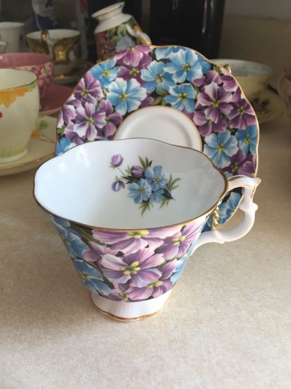 ROYAL ALBERT TEA CUP SAUCER ANGELA Blue Purple FLORAL CHINTZ