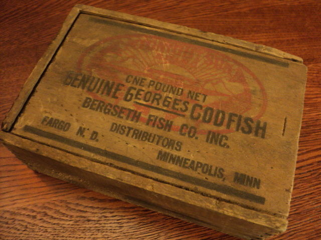 Title (ebay affiliate link): MIDNIGHT SUN BRAND ANTIQUE ONE POUND GENUINE GEORGES CODFISH DOVETAIL WOOD BOX