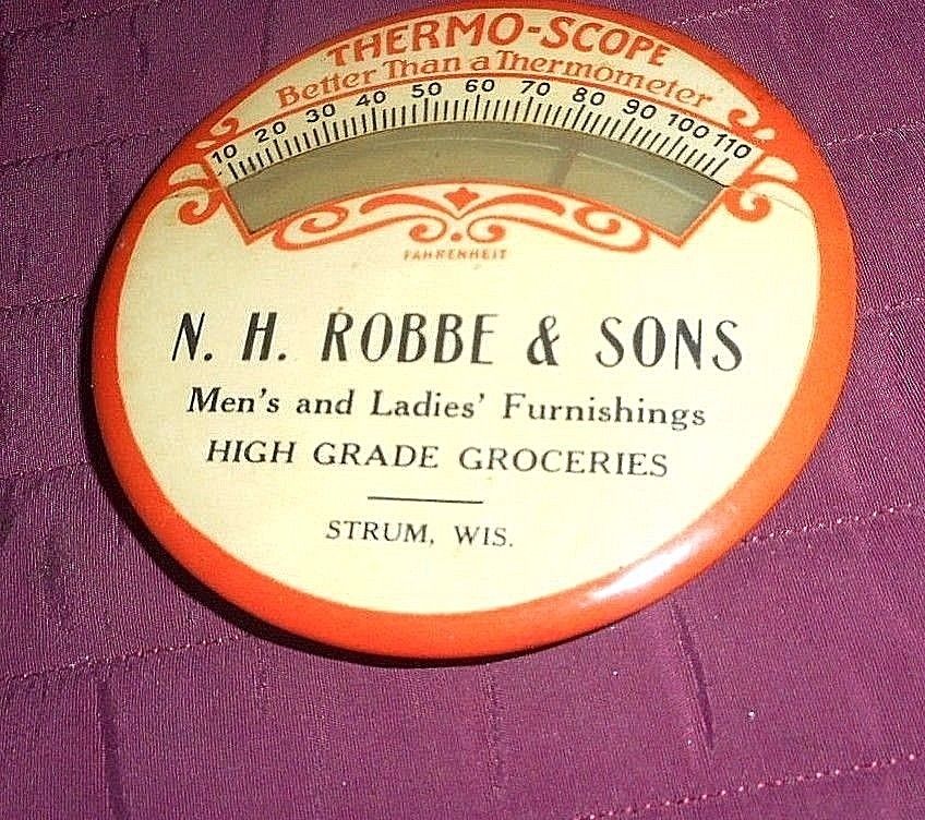 Title (ebay affiliate link): ANTIQUE THERMO-SCOPE ROBBE ADVERTISING - "HIGH GRADE GROCERIES" STRUM WI
