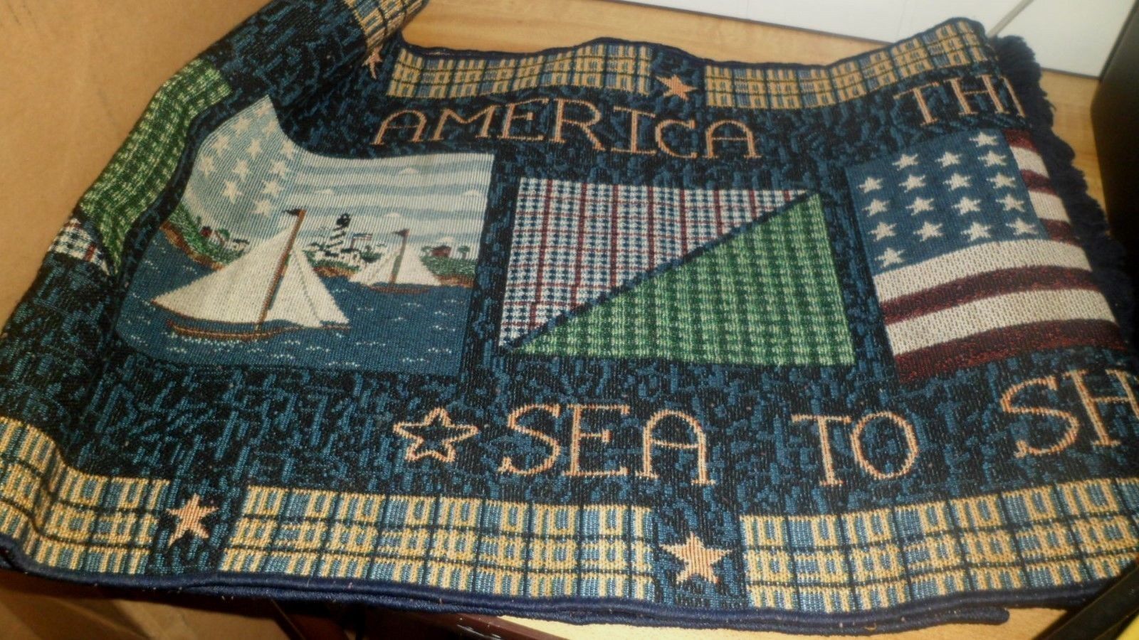 Title (ebay affiliate link): WARREN KIMBLE AMERICANA TABLE RUNNER AMERICA THE BEAUTIFUL FLAG KITCHEN DECOR