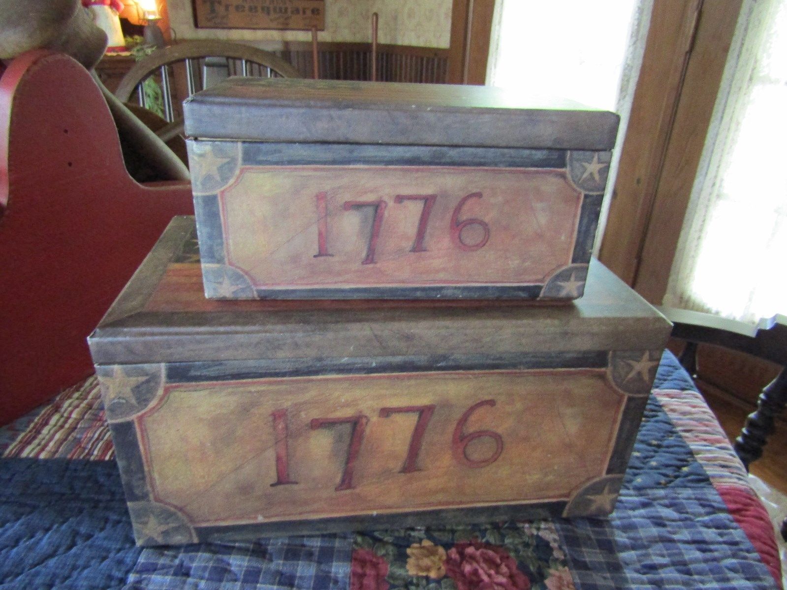 Title (ebay affiliate link): PRIMITIVE SET OF 2 AMERICANA "ANTIQUE LOOK" 1776 STORAGE BOXES