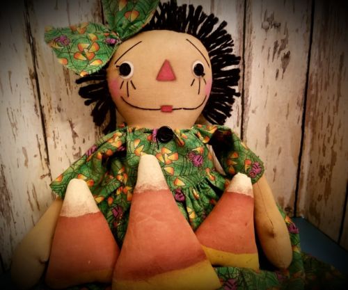 Title (ebay affiliate link): Primitive Halloween Raggedy Annie Doll w/ 3 Candy Corn Ornies