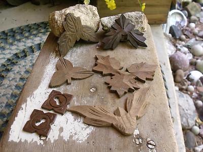 Lot of 5 Small Primitive Antique Carved Wood Furniture Pediments + 2 Escutcheons