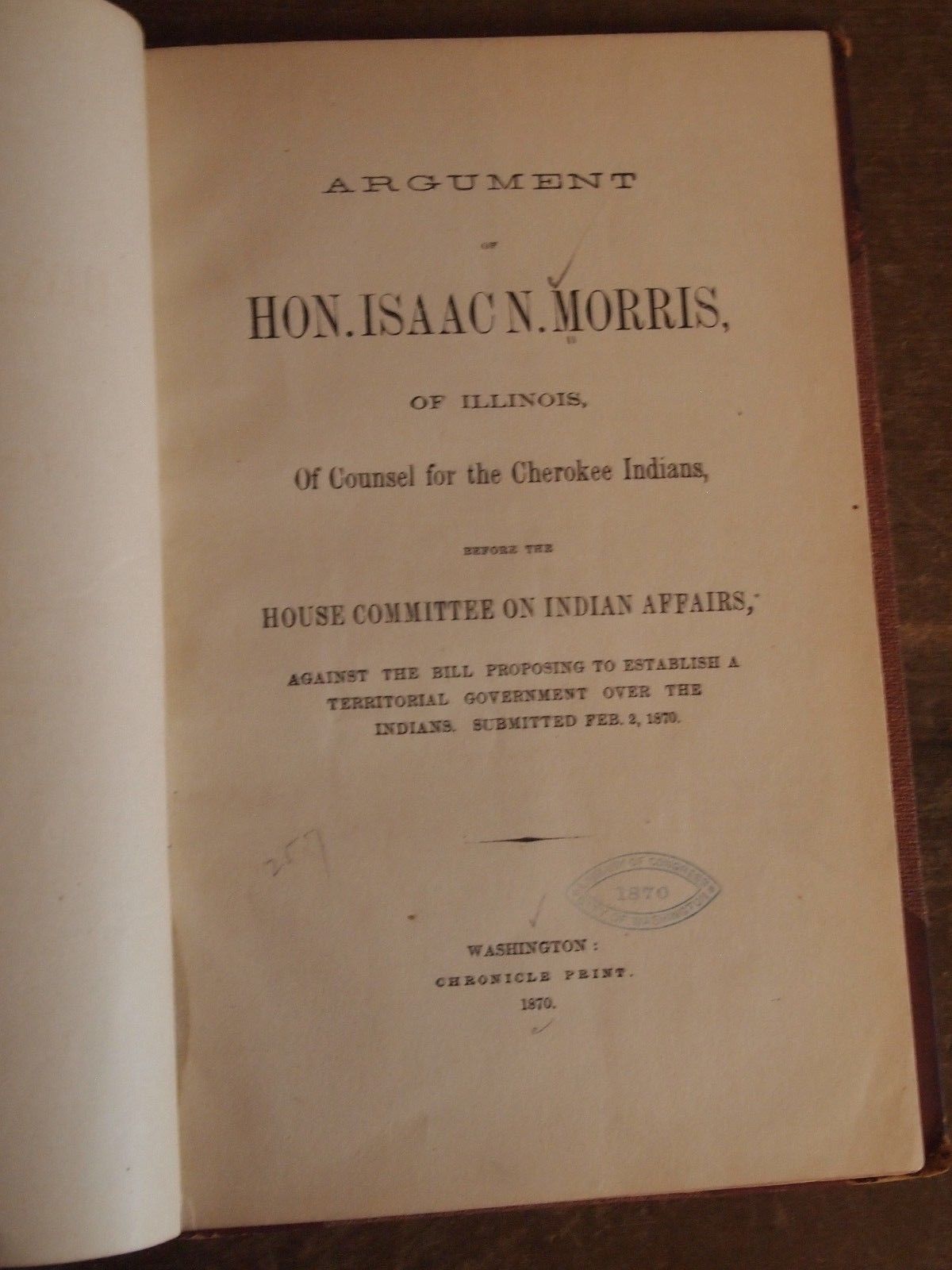 1870 THE CHEROKEE NATION AGAINST THE CREATION OF A TERRITORIAL GOVT ISAAC MORRIS