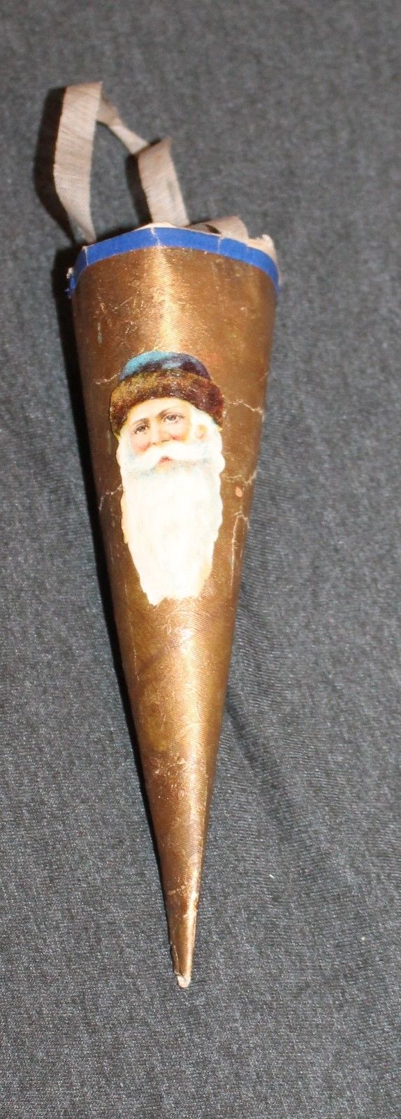Title (ebay affiliate link): Early Gold Foil Cornucopia, Father Christmas Head. Silk Ribbon. 1880s. German
