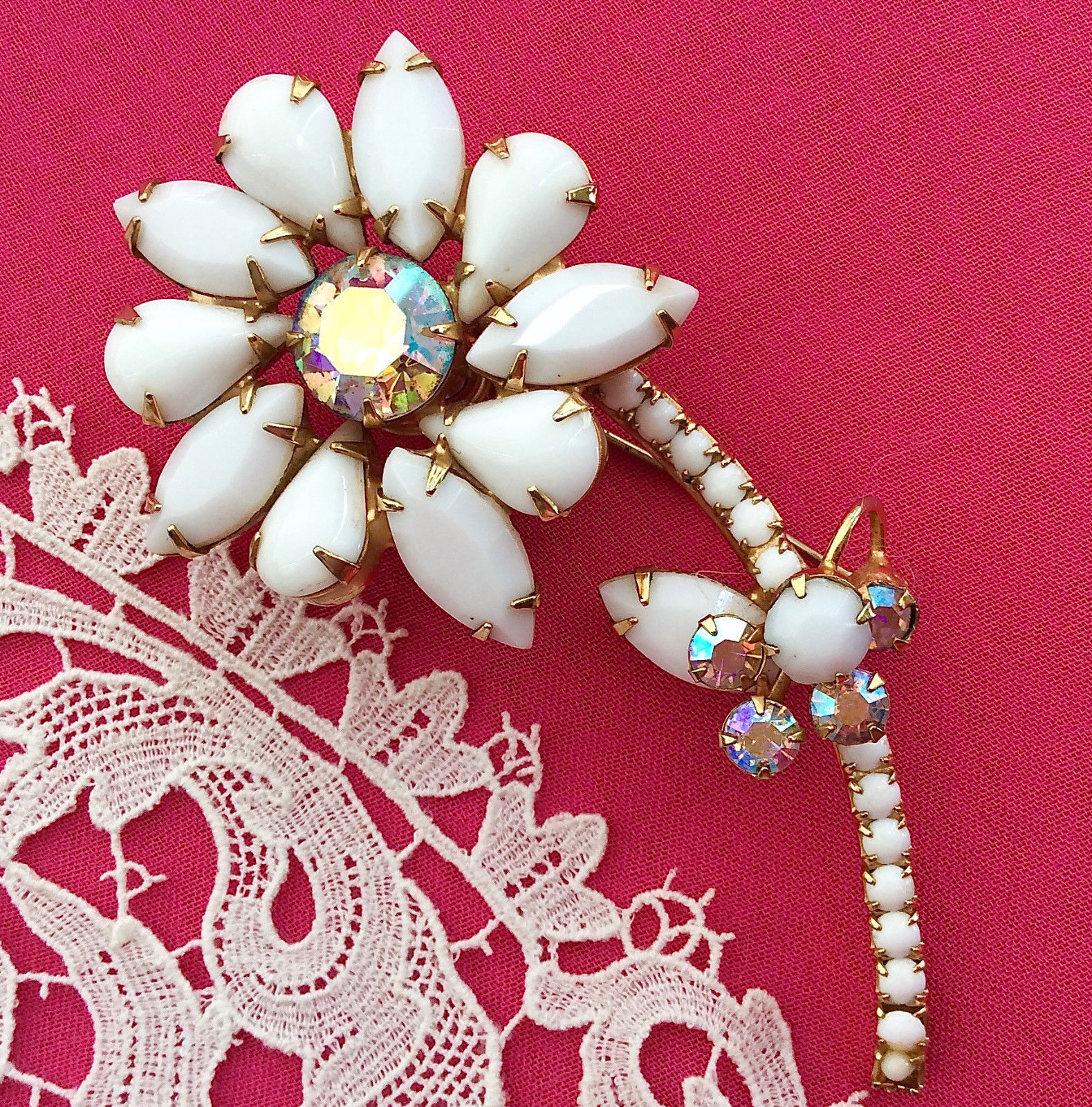 Title (ebay affiliate link): Excellent D&E JULIANA Flower BROOCH Pin MILK GLASS Navette AB Rhinestone Verif