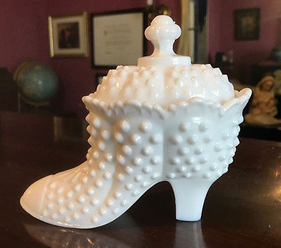 MINT Fenton Milk Glass Covered Hobnail Boot Candy Dish