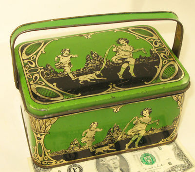 Girls & Puppy candy/ biscuit tin lunch box c1925 USA