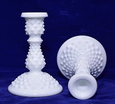 Pair Fenton Milk Glass Hobnail 3674 6" Candleholders