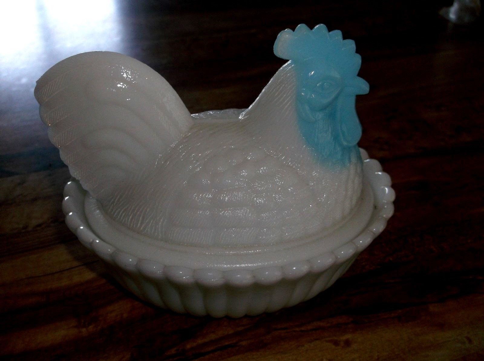 Title (ebay affiliate link): Westmoreland 5" Glass Rooster Dish - Blue and White Milk Glass Chicken on Nest